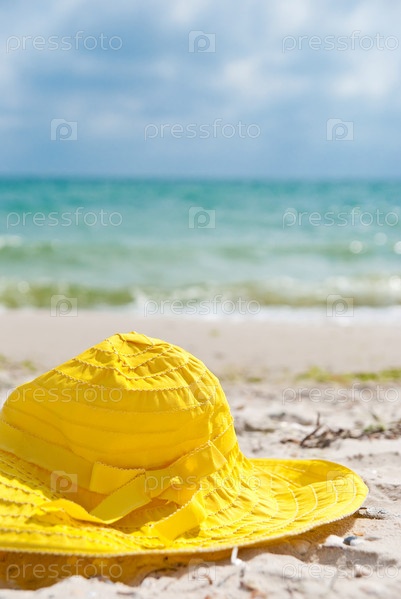 Желтая шляпа на песчаном пляже крупным планом