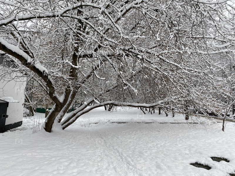 Зима в городском дворе в пасмурный день после снегопада