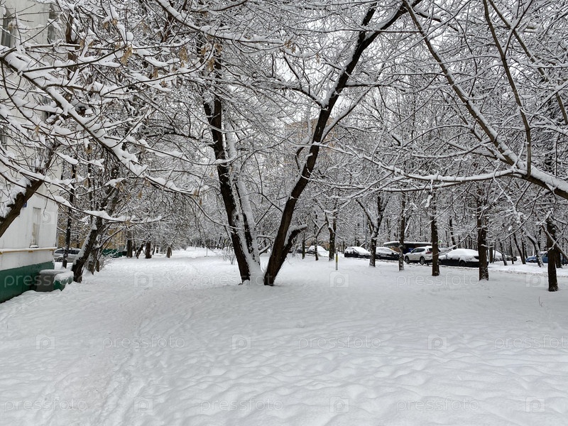Зима в городском дворе в пасмурный день после снегопада