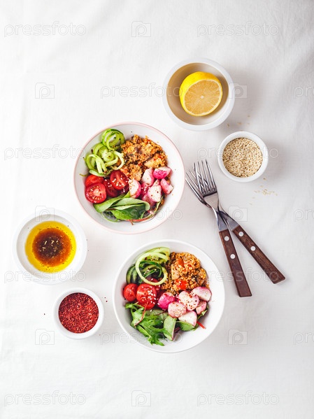 Свежий салат с кускусом, помидорами, огурцом, редисом и мангольдом