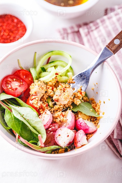 Свежий салат с кускусом, помидорами, огурцом, редисом и мангольдом