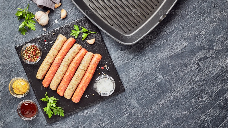 Колбаски из сырого мяса на грифельной доске, с травами и специями и квадратной сковородой для гриля. Вид сверху
