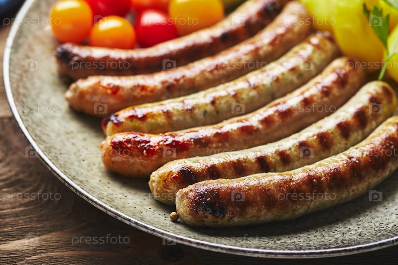 Вкусные жареные колбаски с картофелем и овощами на тарелке крупным планом на деревянном фоне. Вид сверху, плоская планировка