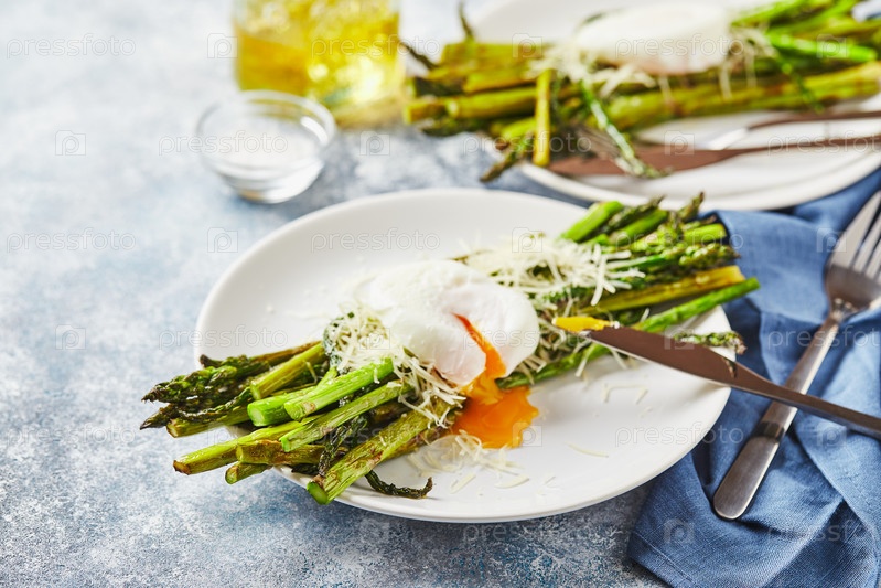 Зеленая спаржа с яйцом-пашот и пармезаном, вегетарианский завтрак подается на двух белых тарелках на светлом фоне