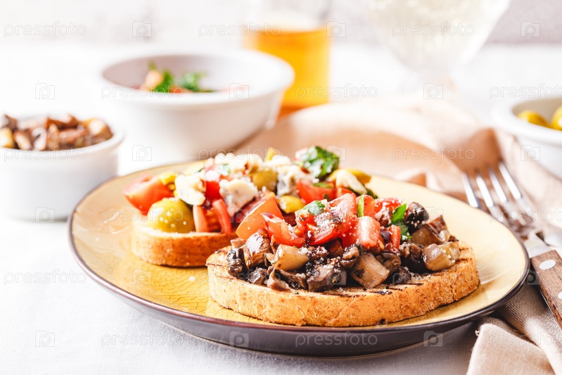 Вкусные брускетты с грибами, голубым сыром, оливками и помидорами