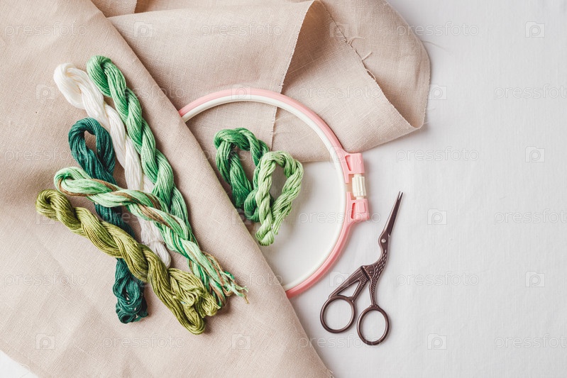 Набор для вышивки. Льняная ткань, схемы для вышивки, пяльцы, цветные нитки и иголки