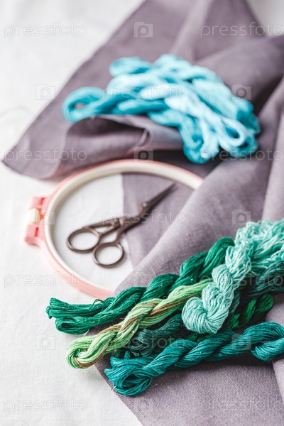 Набор для вышивки. Льняная ткань, схемы для вышивки, пяльцы, цветные нитки и иголки