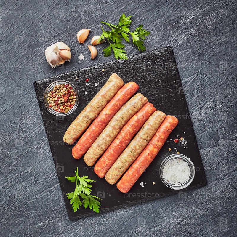 Сырые колбаски мясников на грифельной доске с травами. Вид сверху
