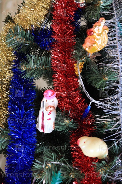 Игрушки на зеленой рождественской ели