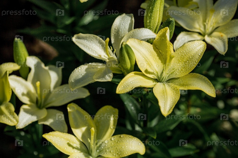Красивая яркая, желтая, садовая лилия в солнечный день с каплями росы, дождем