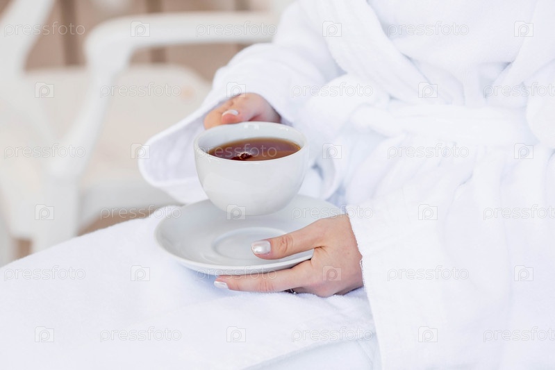 Чашка горячего чая в руках девушки в белом халате. Утро невесты. Концепция пребывания в отеле и начало свадебного дня