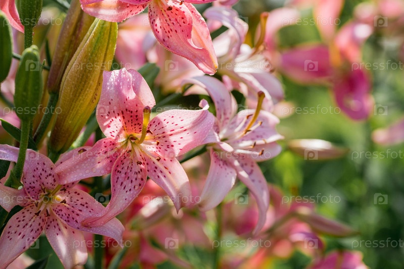 Красивая яркая, розовая, садовая лилия в солнечный день с каплями росы, дождем