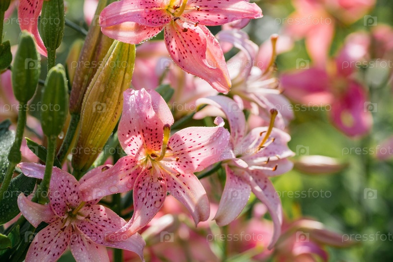 Красивая яркая, розовая, садовая лилия в солнечный день с каплями росы, дождем