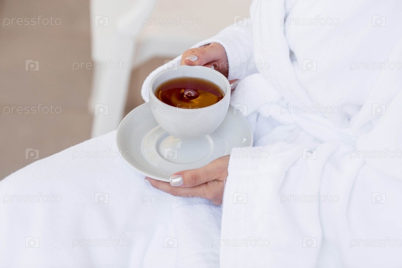 Чашка горячего чая в руках девушки в белом халате. Утро невесты. Концепция пребывания в отеле и начало свадебного дня