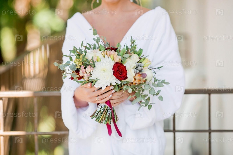 Красивый свадебный букет цветов в руках невесты. Утро в отеле. Крупный план рук с цветами. Свадьба