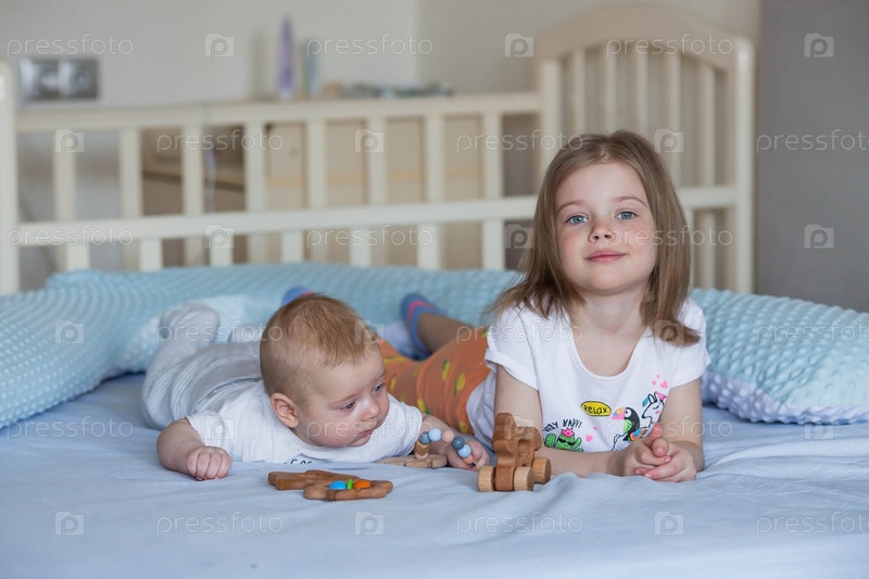 Семья, детство и любовь. Маленькая девочка в постели в светлой спальне играет со своим младшим новорожденным братом. Дети, материнство