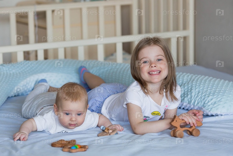 Семья, детство и любовь. Маленькая девочка в постели в светлой спальне играет со своим младшим новорожденным братом. Дети, материнство