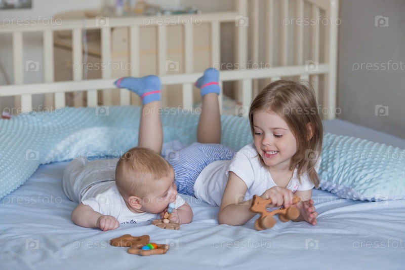 Семья, детство и любовь. Маленькая девочка в постели в светлой спальне играет со своим младшим новорожденным братом. Дети, материнство
