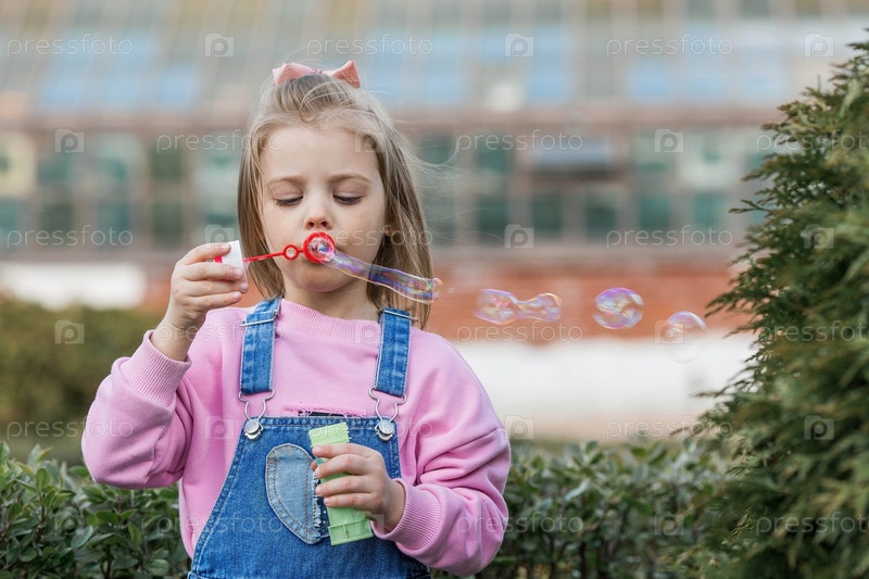 Симпатичная счастливая девушка, играющая с мыльными пузырями в летний день. Ребенок на свежем воздухе, на природе. Концепция счастливого детства и праздника