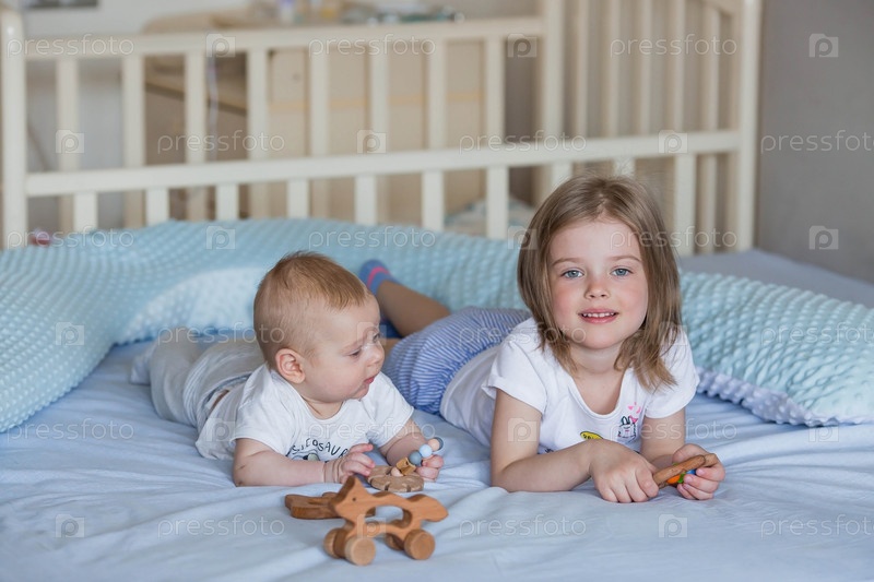 Семья, детство и любовь. Маленькая девочка в постели в светлой спальне играет со своим младшим новорожденным братом. Дети, материнство