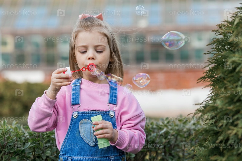 Симпатичная счастливая девушка, играющая с мыльными пузырями в летний день. Ребенок на свежем воздухе, на природе. Концепция счастливого детства и праздника
