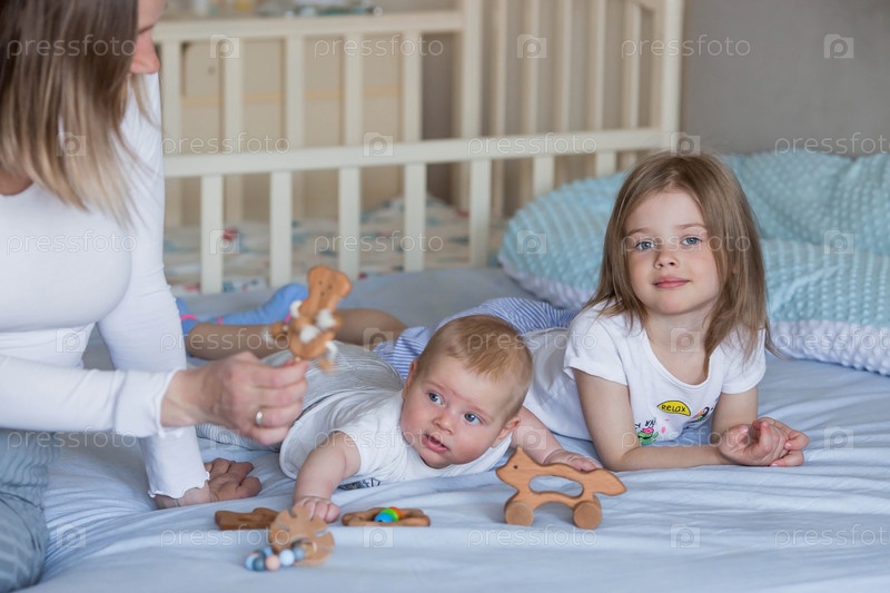 Семья, детство и любовь. Маленькая девочка и мама в постели в светлой спальне играют со своим младшим новорожденным братом. Дети, материнство