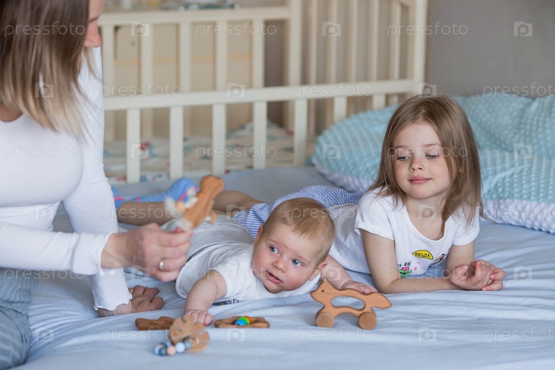 Семья, детство и любовь. Маленькая девочка и мама в постели в светлой спальне играют со своим младшим новорожденным братом. Дети, материнство