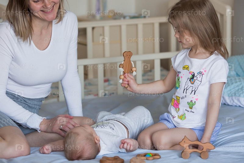 Семья, детство и любовь. Маленькая девочка и мама в постели в светлой спальне играют со своим младшим новорожденным братом. Дети, материнство