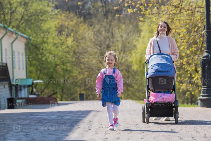 Красивая маленькая девочка в розовой одежде гуляет с мамой с новорожденным братом в коляске в парке на свежем воздухе. Семья, дети, материнство