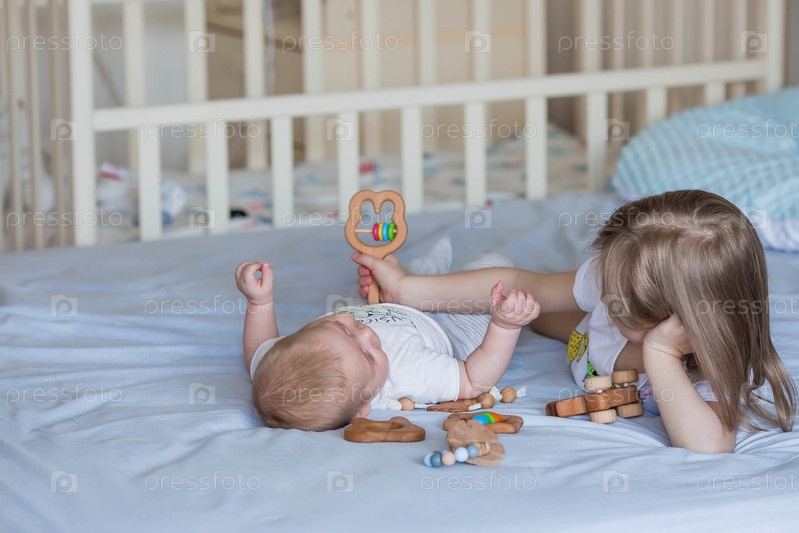 Семья, детство и любовь. Маленькая девочка в постели в светлой спальне играет со своим младшим новорожденным братом. Дети, материнство