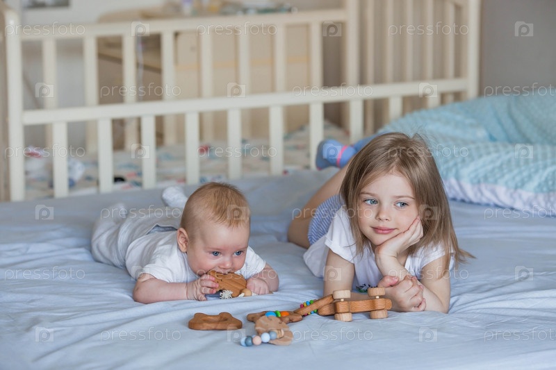 Семья, детство и любовь. Маленькая девочка в постели в светлой спальне играет со своим младшим новорожденным братом. Дети, материнство