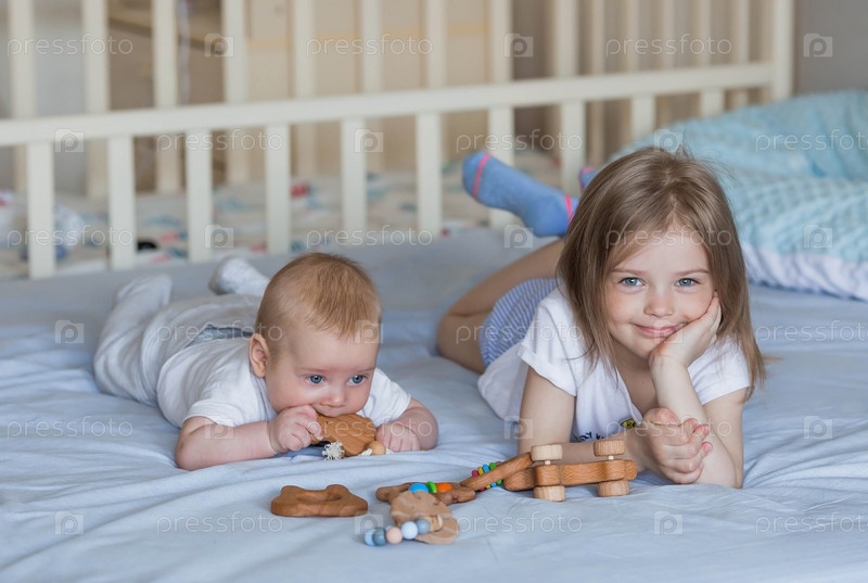 Семья, детство и любовь. Маленькая девочка в постели в светлой спальне играет со своим младшим новорожденным братом. Дети, материнство