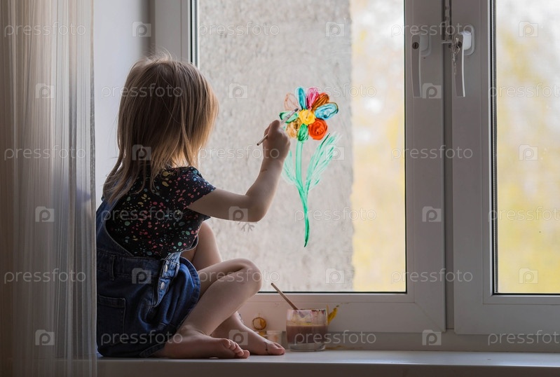 Искусство и творчество. Счастливая маленькая девочка 4 лет рисует цветы на окне. Детские игры для развития ребенка. Весеннее время