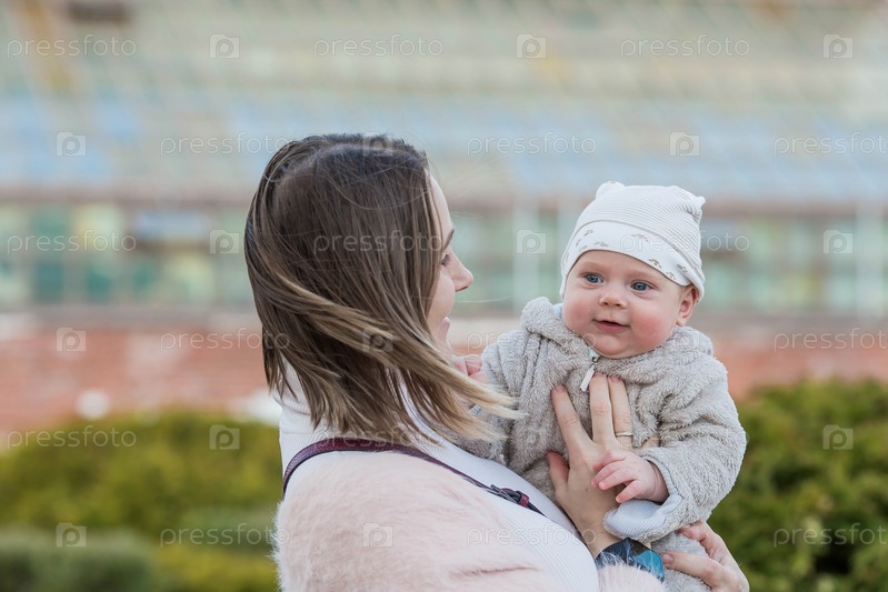 Молодая мама держит на руках очаровательного сынишку. Малыш смотрит в камеру и улыбается. Портрет красивого пухлого 4-месячного ребенка