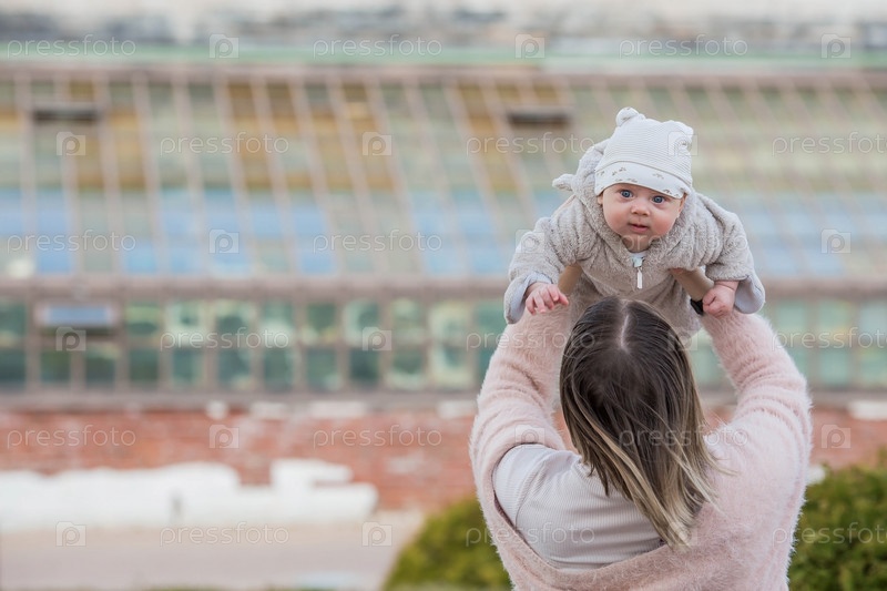 Милый маленький мальчик играет со своей мамой на улице. Счастливый ребенок подброшен в парке. Малыш весело смеется. Портрет мальчика. День матери