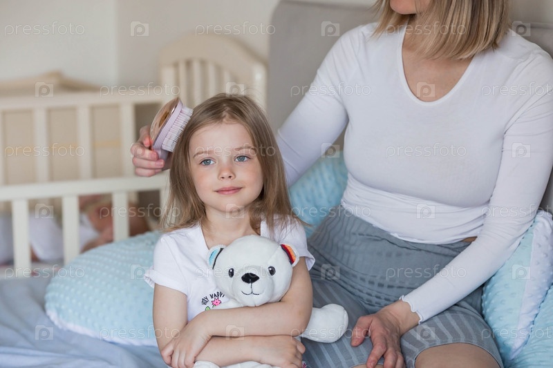 Счастливая молодая мать расчесывает волосы своей очаровательной маленькой дочери, сидя утром в постели. Девушка улыбается. Семья и забота