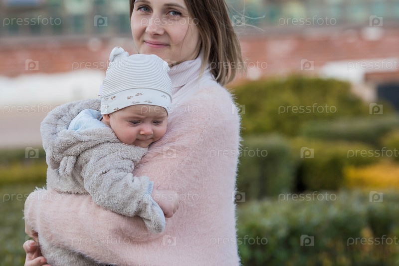 Молодая мама держит на руках очаровательного сынишку. Малыш смотрит в камеру и улыбается. Портрет красивого пухлого 4-месячного ребенка