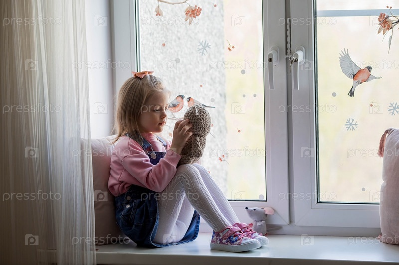 Семья, детство и любовь. Портрет красивой маленькой девочки, сидящей на подоконнике. У окна играет ребенок с плюшевым мишкой в руках. Детство и опасность