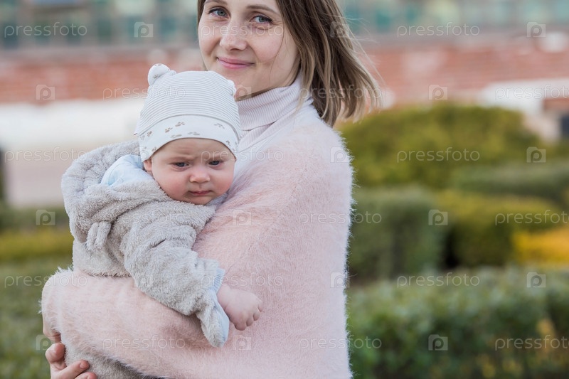 Молодая мама держит на руках очаровательного сынишку. Малыш смотрит в камеру и улыбается. Портрет красивого пухлого 4-месячного ребенка