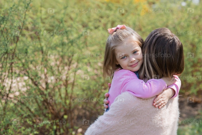 Красивая маленькая девочка в розовой одежде гуляет со своей мамой в парке на свежем воздухе. Ребенок обнимает свою мать. Семья, любовь, дети, материнство