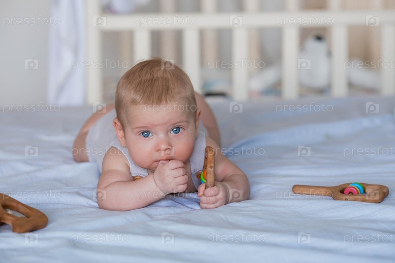Очаровательный мальчик в яркой спальне. Новорожденный ребенок лежит на кровати и грызет игрушки. Зубы режутся. У ребенка чешутся десны. Семья, беременность и роды