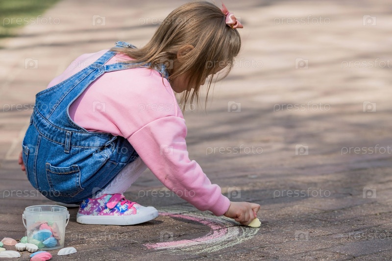Счастливая девушка в розовой одежде рисует радугу мелом на асфальте на улице. Портрет маленькой девочки, рисующей радужным мелом в солнечный летний день. Творческое развитие детей