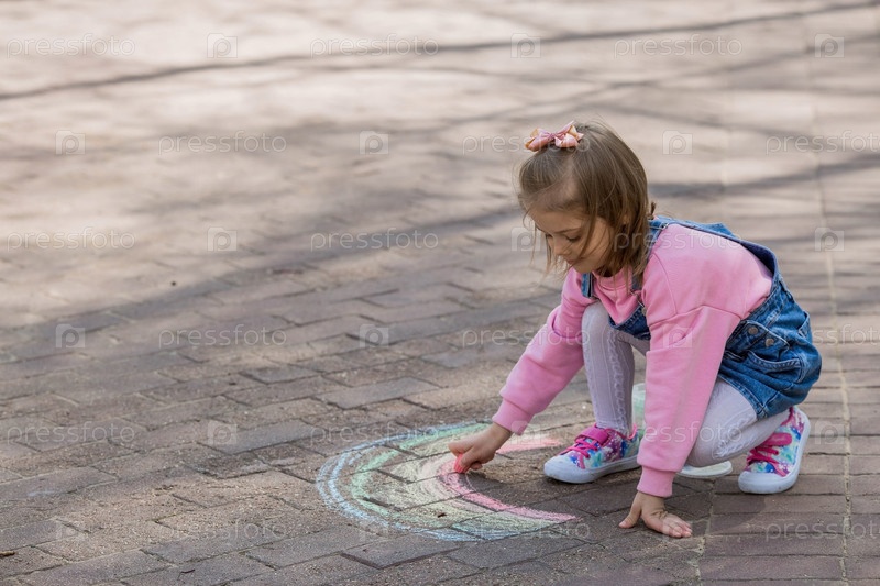 Счастливая девушка в розовой одежде рисует радугу мелом на асфальте на улице. Портрет маленькой девочки, рисующей радужным мелом в солнечный летний день. Творческое развитие детей