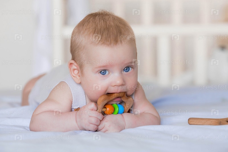 Очаровательный мальчик в яркой спальне. Новорожденный ребенок лежит на кровати и грызет игрушки. Зубы режутся. У ребенка чешутся десны. Семья, беременность и роды