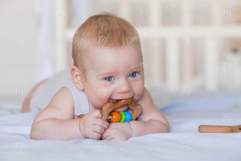 Очаровательный мальчик в яркой спальне. Новорожденный ребенок лежит на кровати и грызет игрушки. Зубы режутся. У ребенка чешутся десны. Семья, беременность и роды