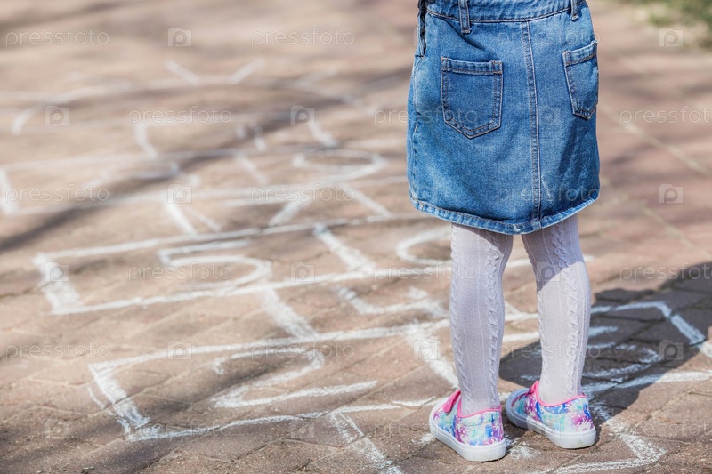 Счастливая девушка в розовой одежде рисует классику мелом на асфальте на улице. Портрет маленькой девочки, играющей и прыгающей в классики в солнечный летний день. Творческое развитие детей