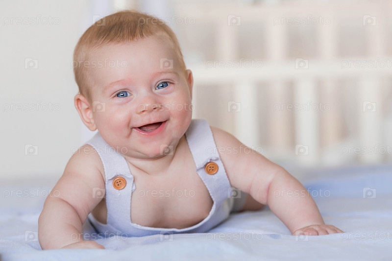 Очаровательный мальчик в яркой спальне. Новорожденный ребенок лежит на кровати. Ребенок 4 месяцев смотрит и улыбается в камеру. Постельные принадлежности для детей. Семья, беременность и роды