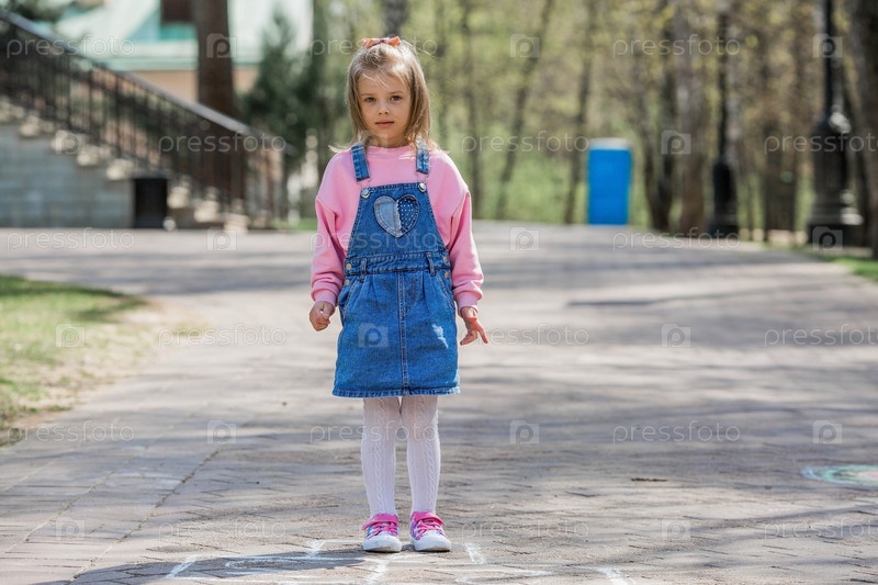 Счастливая девушка в розовой одежде рисует классику мелом на асфальте на улице. Портрет маленькой девочки, играющей и прыгающей в классики в солнечный летний день. Творческое развитие детей