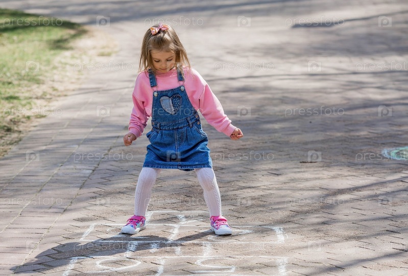 Счастливая девушка в розовой одежде рисует классику мелом на асфальте на улице. Портрет маленькой девочки, играющей и прыгающей в классики в солнечный летний день. Творческое развитие детей