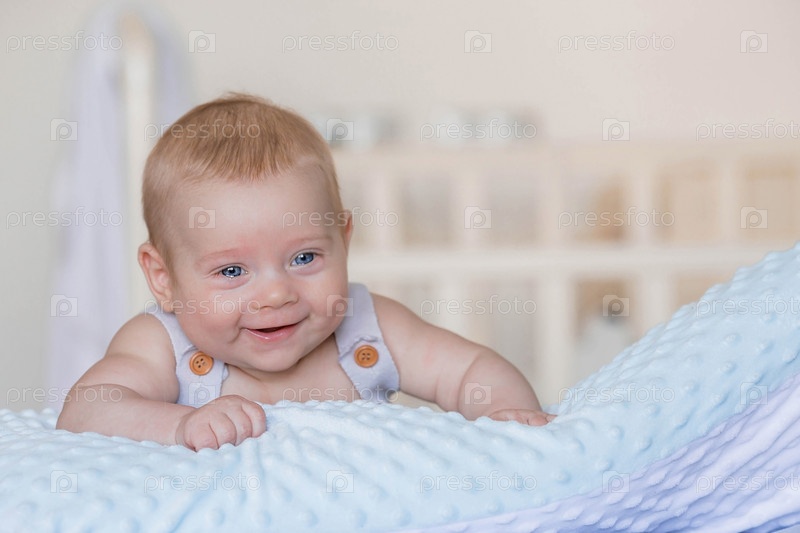 Очаровательный мальчик в яркой спальне. Новорожденный ребенок лежит на кровати. Ребенок 4 месяцев смотрит и улыбается в камеру. Постельные принадлежности для детей. Семья, беременность и роды